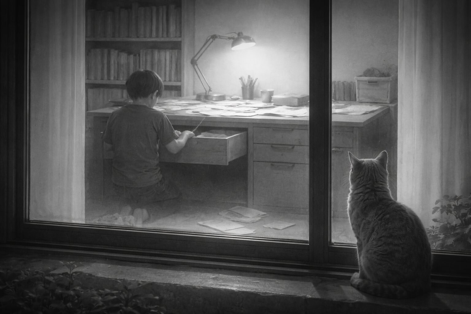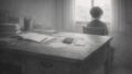 古いビルの廊下には人の気配がなく、窓から入る光だけが、机の上の紙の白さを浮かび上がらせている。